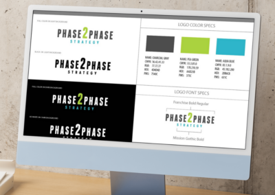 The primary goals were to establish a more elevated and enduring brand identity within the industry, while also expanding appeal to a broader client base. The branding strategy leveraged a suite of tools designed to convey a cohesive and immediate corporate image, positioning Phase2Phase Strategy as a seasoned, credible partner that embodies the strategic excellence it delivers to clients. Key deliverables included a logo redesign, refreshed brand color palette, website redesign, PowerPoint template, and a branded business card. We also included a branded HTML email signature (not shown). Here we have a few highlights from the comprehensive rebrand. In the end, the client was thrilled, expressing sincere enthusiasm about how the campaign has revitalized the company’s overall brand presence.